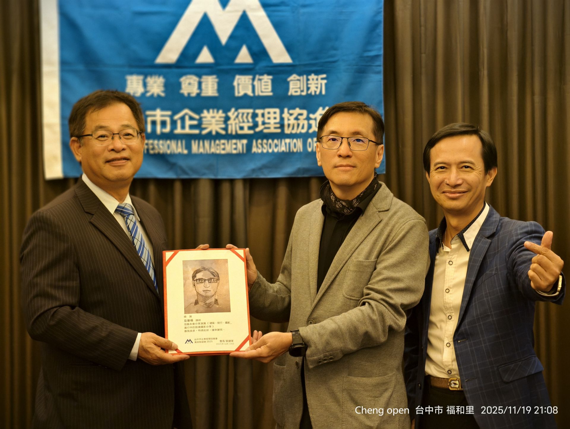 ▲圖左台中菁英會張健家會長致贈感謝狀 圖中 巫基福 建築師 圖右 廖國智 先生/覞傳媒 攝