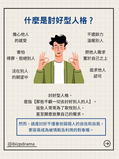 在心理學上,這種模式常與「迎合型人格障礙」(Pandering Personality Disorder)相關。它並非正式診斷名稱,但深刻描繪了「討好型人格」若趨於極端,可能對生活造成嚴重干擾。此類人格通常具備以下四項特徵: