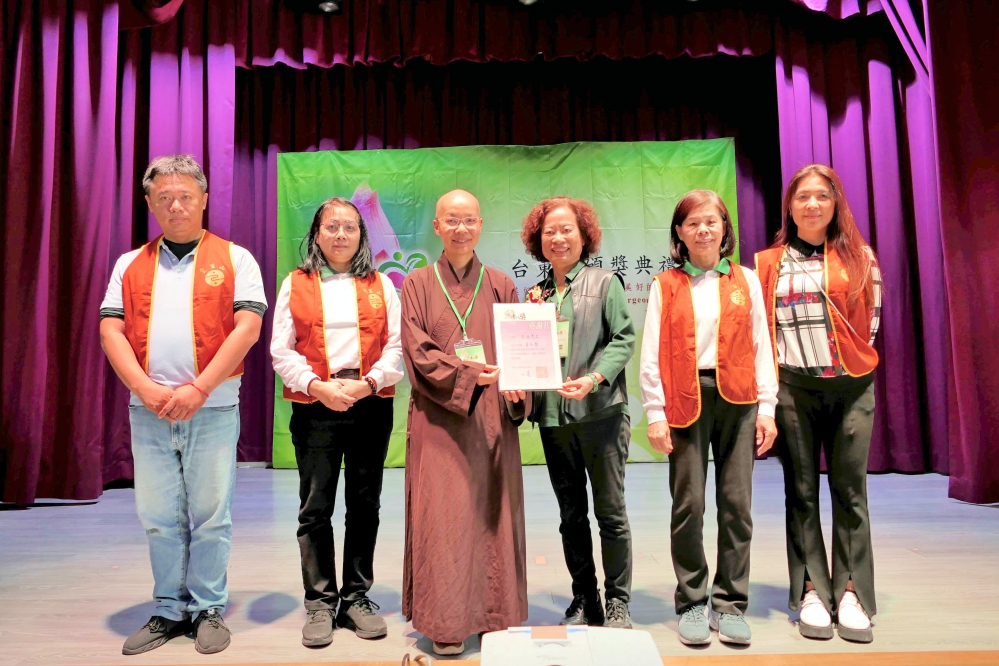 ▲靈鷲山台東中心監院法泰法師(左三)頒發感謝狀給家訪志工。(圖/靈鷲山佛教教團提供)