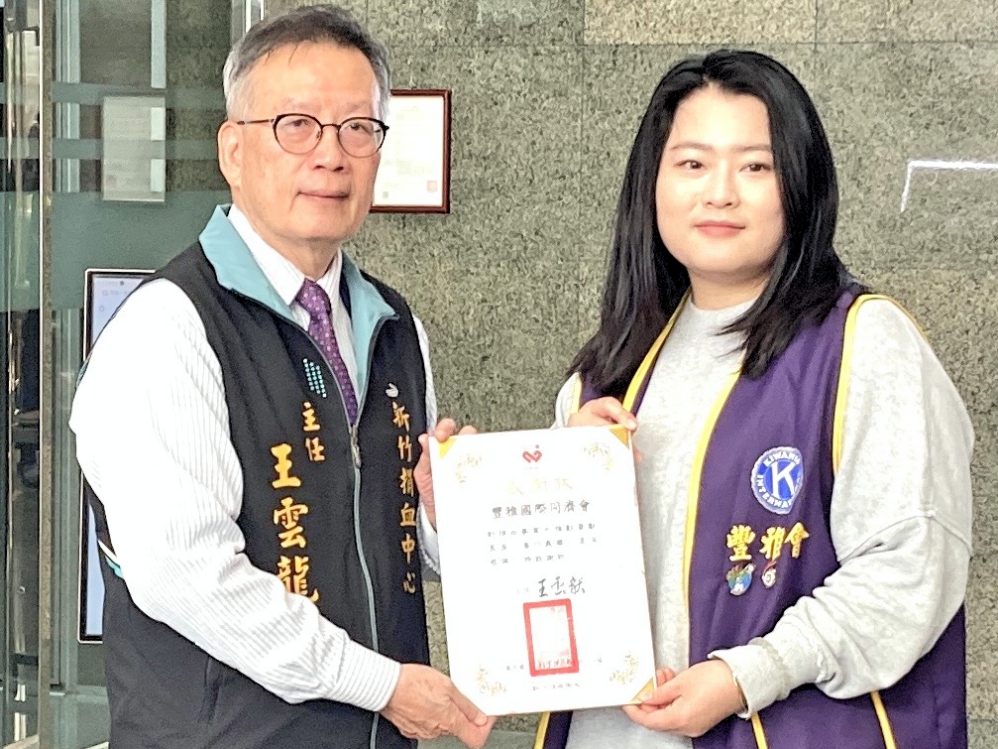 ▲新竹捐血中心聯手新竹縣警察局志工大隊1月18日舉辦 「捐血傳愛,守護生命!」捐血活動,新竹捐血中心主任王雲龍(左)致贈感謝狀予豐雅國際同濟會。